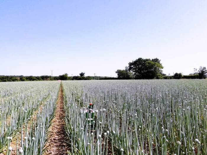 Comparé à des outils tractés type tracteur et bineuse, il peut intervenir à tous les stades de la culture, même tardifs, et même lors qu’apparaissent les pompons sur oignon.